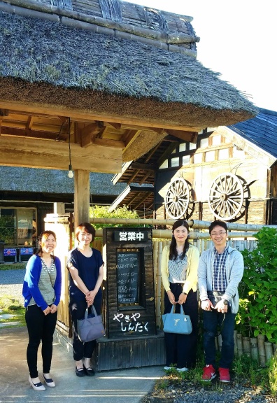 ひよりでは何度も利用している店ですが、ゆたかな郷のスタッフは初めてで、かやぶき屋根や囲炉裏の金網の上で食材を焼いて食べることに感心していました。